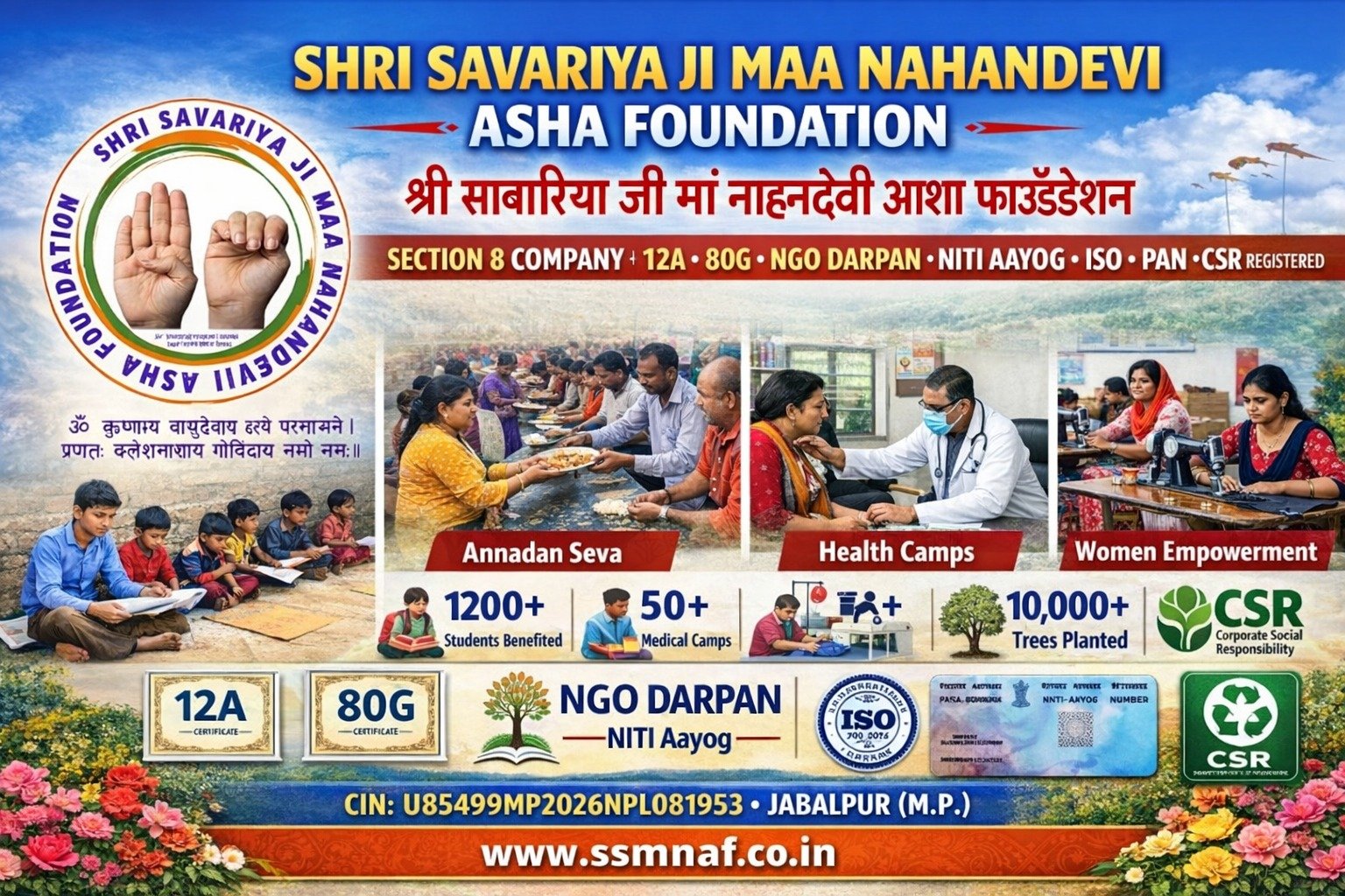 SHRI SAVARIYA JI MAA NAHANDEVI ASHA FOUNDATION is a registered Section 8 Non-Profit Organization dedicated to social upliftment and community development. We focus on Social Welfare Programs, Manpower Support Services, and Educational Empowerment to build a self-reliant and progressive society.